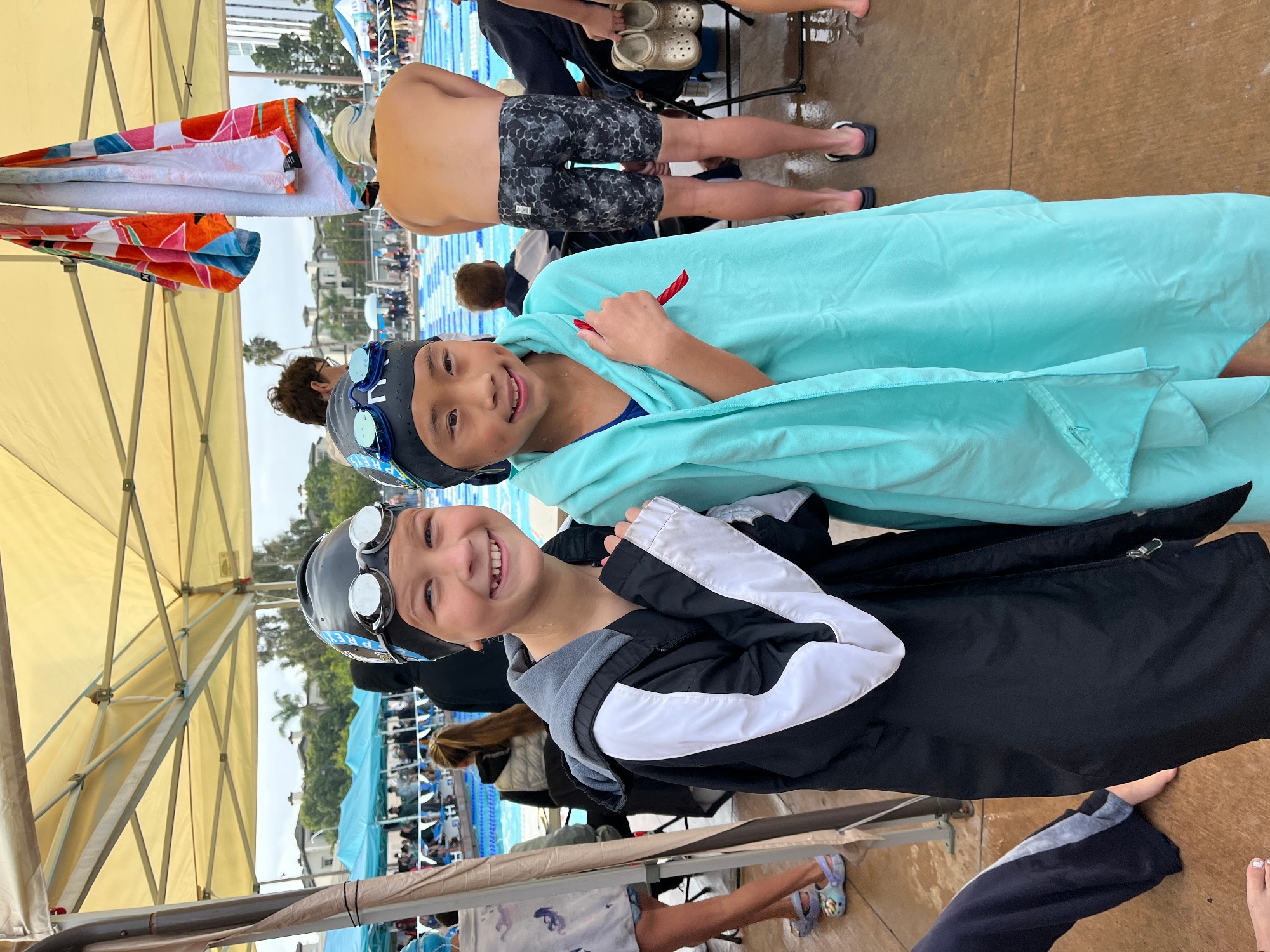 *Pictured: Day 1 Team Stretch before Warm Up, and Red Group swimmers Nina K. and Violet W.